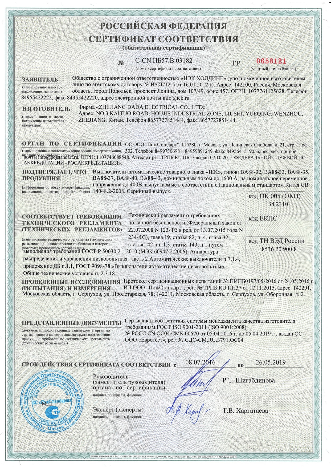 Автоматические выключатели ВА88 предназначены для проведения тока в нормальном режиме и отключения тока при коротких замыканиях, перегрузке, недопустимых снижениях напряжения, а также для оперативных включений и отключений участков электрических цепей и рассчитаны для эксплуатации в электроустановках с номинальным рабочим напряжением до 400 В и на номинальные токи от 12,5 до 1600 А. Соответствуют требованиям ГОСТ Р 50030.2. Простая самостоятельная установка дополнительных устройств: - аварийный контакт; - дополнительный контакт; - независимый расцепитель; - расцепитель минимального напряжения; - привод ручной поворотный; - электропривод; - втычная панель; - выдвижная панель. Стандартная комплектация каждого автоматического выключателя состоит из переходных шин или кабельных наконечников (в зависимости от типоразмера), межфазных перегородок, комплекта винтов и гаек для подсоединения проводников, комплекта винтов для крепления автоматического выключателя к монтажной панели.